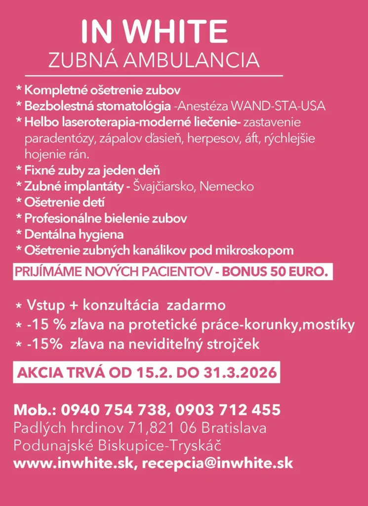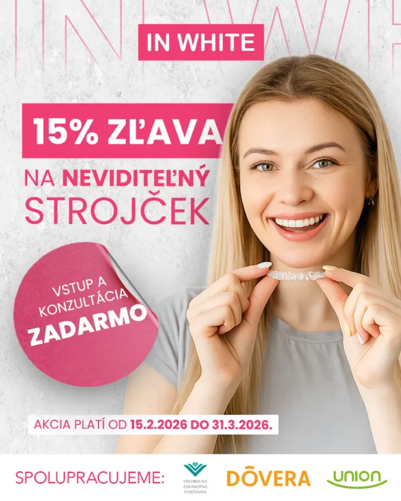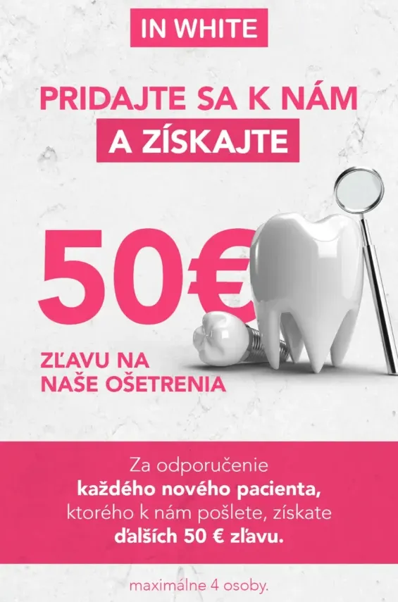 Stomatologická ambulancia In White, otvorená od roku 2017, je určená všetkým klientom, ktorí od zubného lekára očakávajú profesionálny prístup, kvalitné služby a bezbolestné ošetrenie s použitím najmodernejších stomatologických postupov a technológií. Náš tím s bohatými zahraničnými pracovnými skúsenosťami a kontinuálnym zahraničným vzdelávaním Vám v nových moderných priestoroch poskytnú kvalitné ošetrenie, precíznu starostlivosť a prvotriedne služby. Každý klient je vždy vopred oboznámený s liečebným plánom a detailmi plánovaného zákroku vrátane cenovej kalkulácie stomatologického ošetrenia.